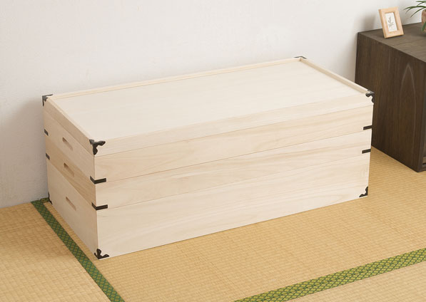 【送料無料(一部地域除く】桐衣装箱 3段【たとう紙に入った着物を約10?11枚収納】【%OFF】【P1119I】【05P24Nov09】【★1120-point★】価格: 7,999円レビュー評価: 0.0 レビュー数:0 ■商品についてたとう紙に入った着物を約10?11枚収納できます桐材は内部を一定の湿度に保とうとする働きがあります。桐衣装箱は大切な衣類の保管に最適です。着物がたとう紙ごと入る大きさで、タンスの上や押入れに置ける桐衣装箱です。家具で有名な九州・大川で生産しています。引出の底板にも桐材に両面桐の綺麗な突き板を張っていますので、ここもアピールポイントです。■商品の仕様本体:天然木(桐材)、引出し底板・背板:天然木桐化粧板。商品重量:約6kg日本製■商品サイズサイズ:(約)幅91×奥行42×高さ35cm内寸<浅>:(約)幅88×奥行39×高さ6cm <深>:(約)幅88×奥行39×高さ13cm■備考画 |